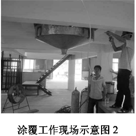 將150L的不銹鋼反應(yīng)釜側(cè)放在水平地面,操作人員鉆進(jìn)反應(yīng)釜,對反應(yīng)釜內(nèi)壁進(jìn)行噴涂。為避免霧氣對人員在操作過程中的傷害,噴涂人員佩戴防毒面具,頭戴防塵帽。并在反應(yīng)釜開口處安裝了工業(yè)風(fēng)扇對霧氣進(jìn)行消除,以減少對人體的傷害。